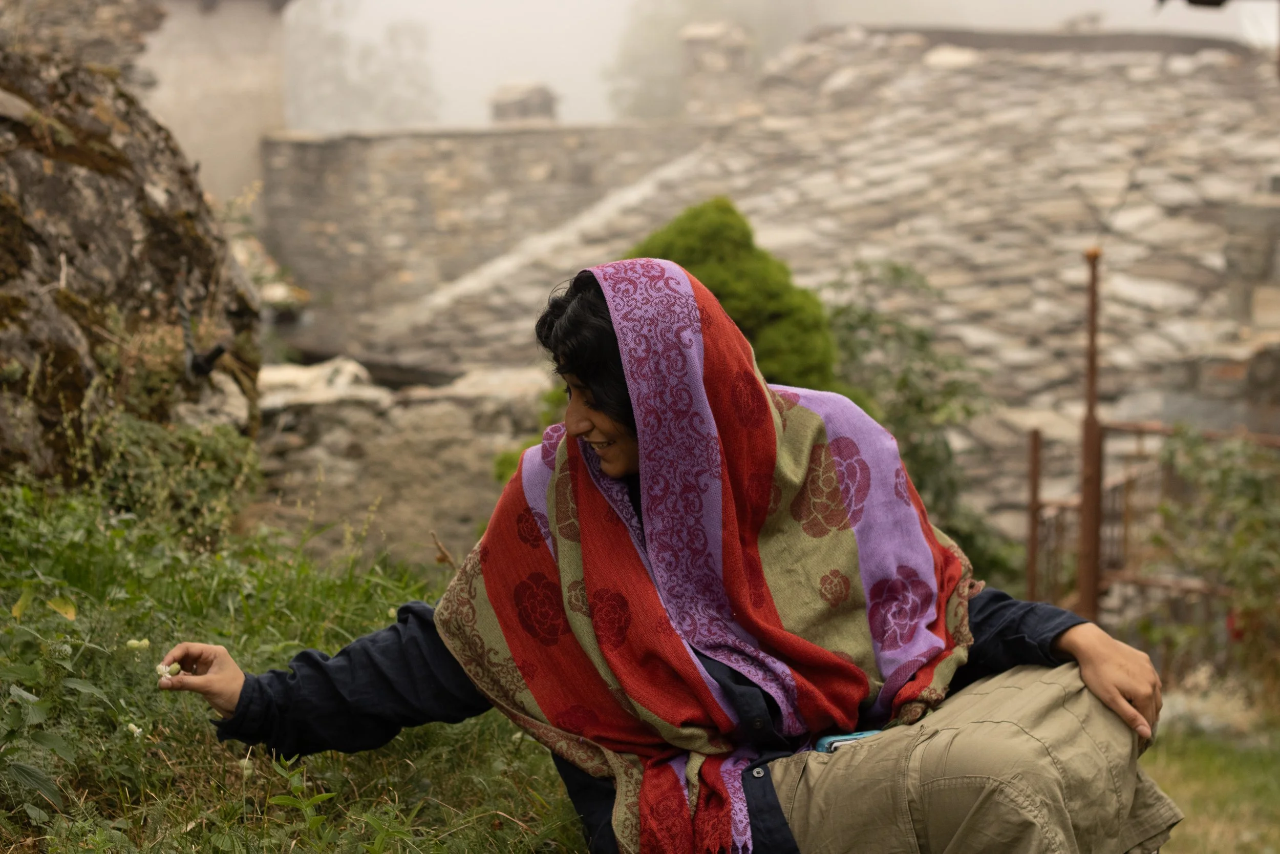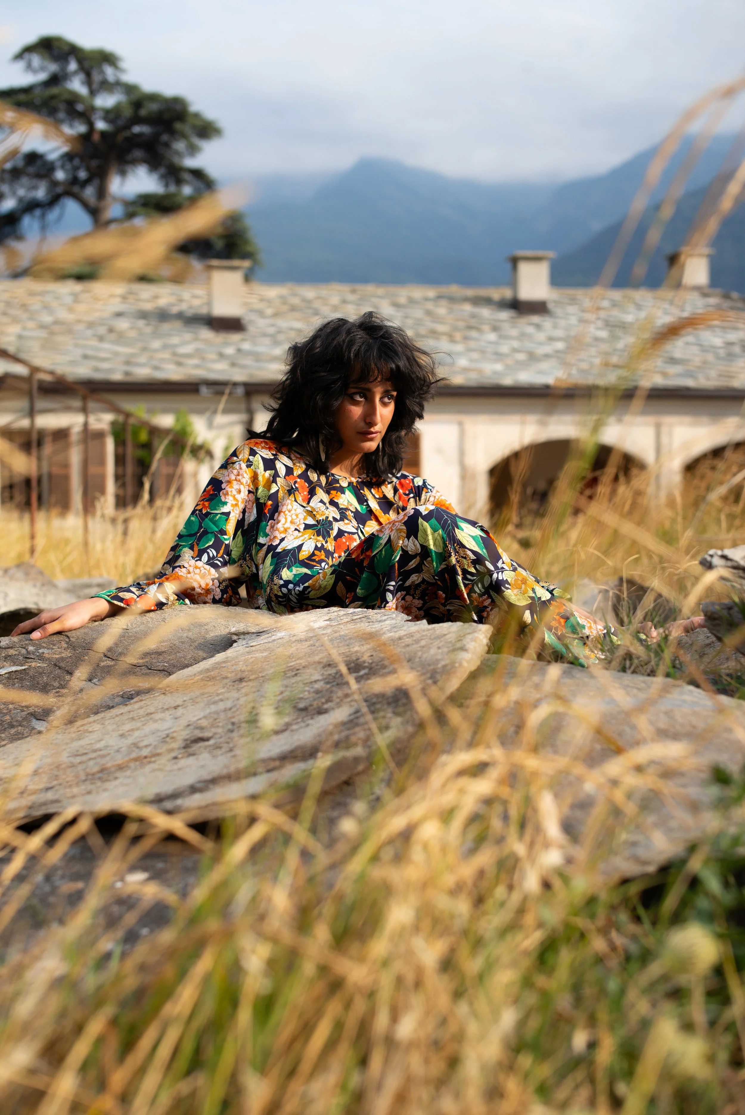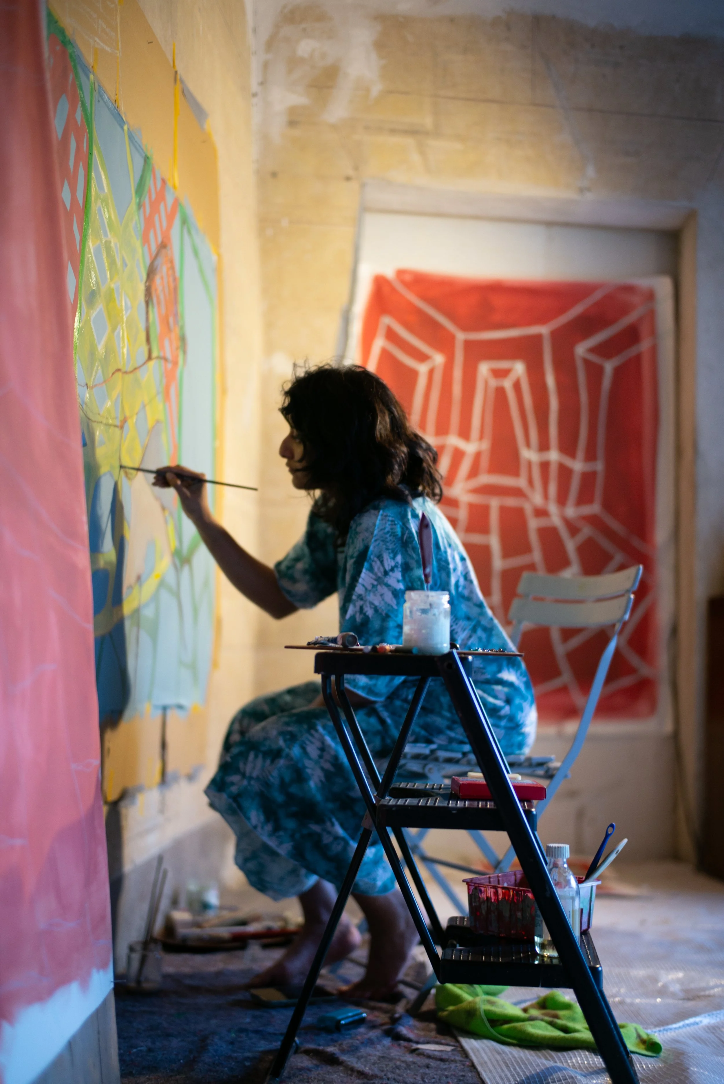 During the summer 2025 session of the Vertygo residency in Mompantero, Almaha spent several weeks working alongside artist Safeya Sharif. Their days often unfolded through long painting sessions on canvas, using the residency space as both studio and point of reference. Al Maha’s work explored the relationship between Khaliji bodies and Western furniture, a theme that naturally resonated with the residency house itself, where old pieces of furniture became part of her visual experiments. Beyond the studio, she spent time exploring the valley quietly observing the local environment and its traditions of naïve painting. The residency became a moment of reflection, experimentation, and discovery, both within the studio and throughout the surrounding valley.
